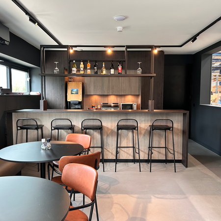 De keuze voor donkere wanden in combinatie met warme houten kozijnen en interieur geeft het kantoor een uitnodigende en warme uitstraling. Deze elementen dragen bij aan de identiteit van Barendregts' Kistenfabriek en creëren een sfeer waarin medewerkers zich thuis voelen.